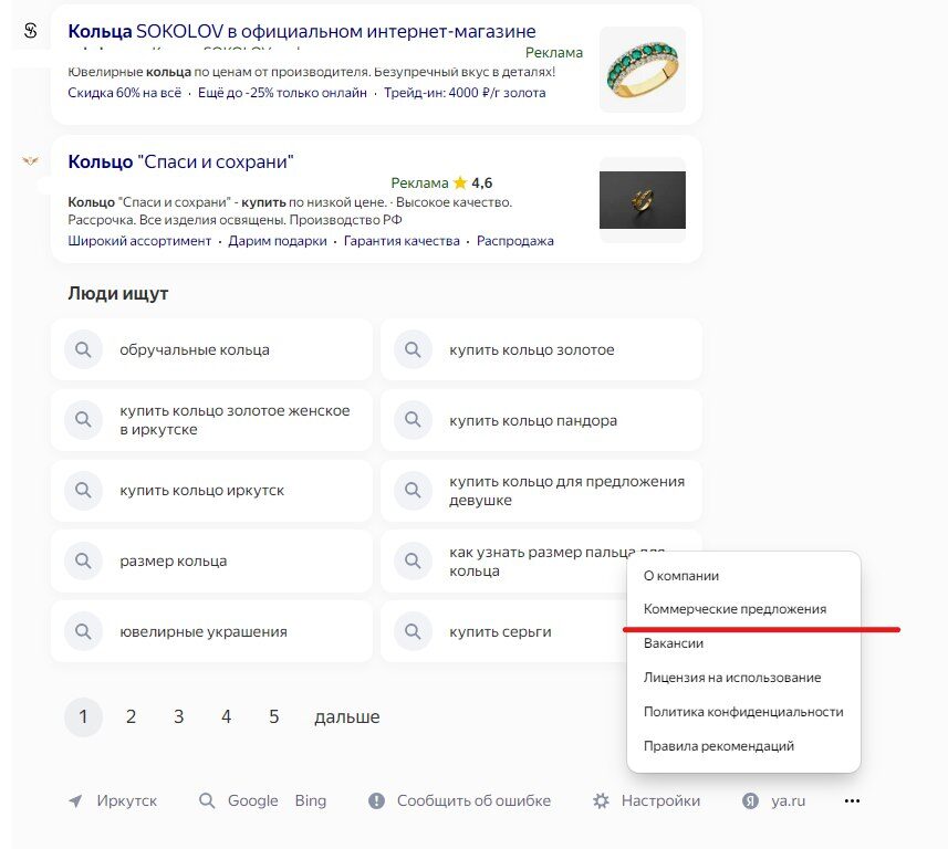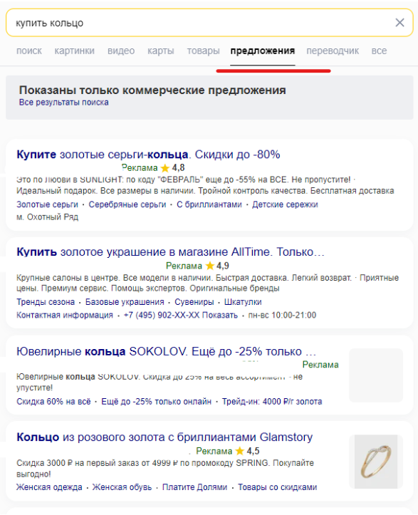 Далее идет SEO-выдача. Если вы хотите увидеть только рекламные предложения, прокрутите страницу вниз, нажмите на 3 точки и кликните на «Коммерческие предложения».