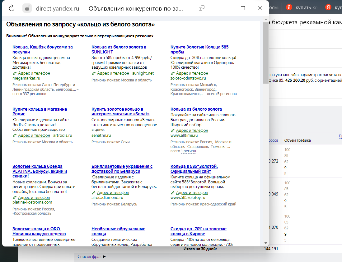 После этого нам открывается окно с объявлениями конкурентов. Цель выполнена!