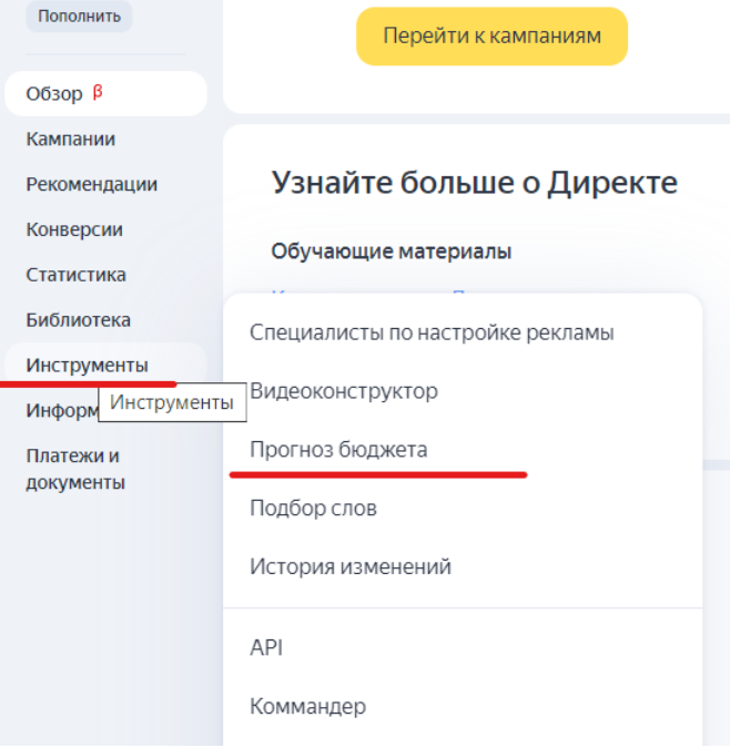 Чтобы воспользоваться этим методом, перейдите в Яндекс Директ >> вкладка «Инструменты» >> «Прогноз бюджета».