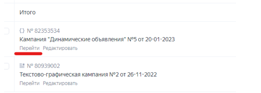 Чтобы воспользоваться этим способом, перейдите в Директ во вкладку «Кампании». Затем в любой кампании, где собрана семантика, нажмите на кнопку «Перейти».