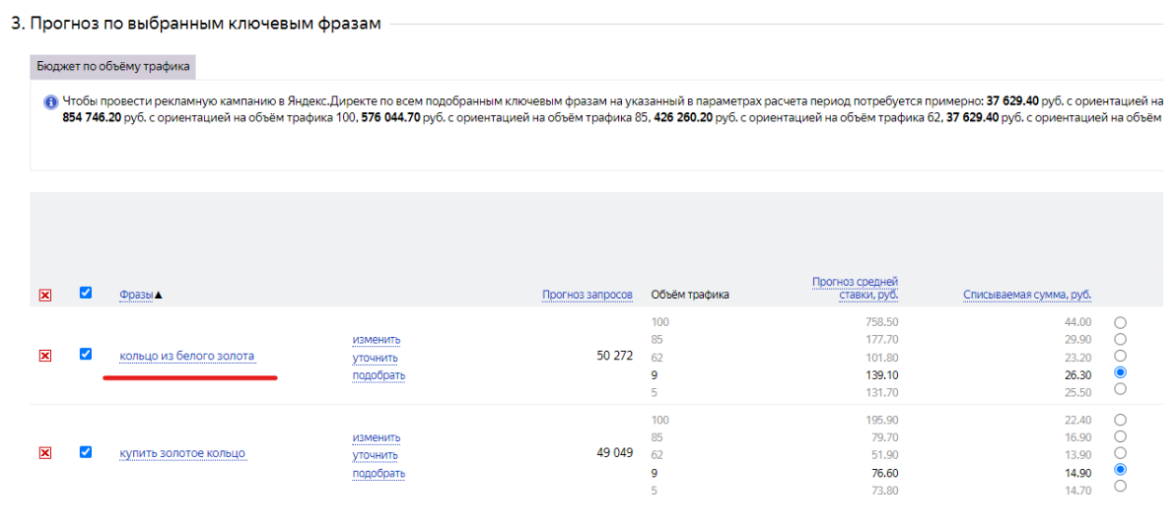 Вы увидите ключевые фразы, которые вводили и прогноз бюджета по ним. Прогноз нам не нужен. Нажимаем на ключевую фразу: