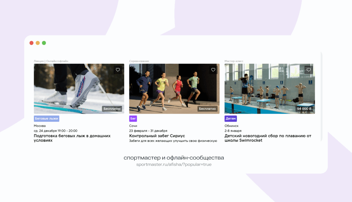 Пример: «Спортмастер» развивает офлайн-сообщества вокруг бега. Бренд создаёт регулярные локальные активности, где люди собираются по общему интересу, а компания выступает организатором и партнёром. Участники встречаются на постоянной основе, тренируются вместе, участвуют в городских забегах и тестируют экипировку в процессе занятий. Продукт не продвигается отдельно, а становится частью совместного опыта.