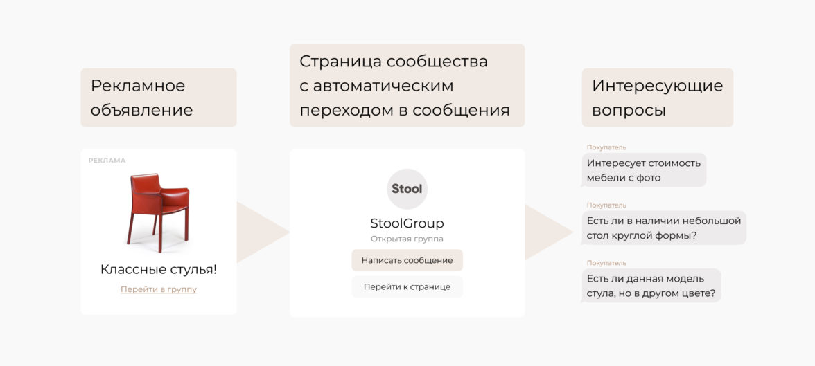 Времени на оптимизацию не было: близилось лето, традиционно низкий сезон для мебельного рынка, а продажи продолжали неуклонно снижаться. Мы предложили другую модель — не уводить пользователей из ВКонтакте, а перевести все сделки в сообщения сообщества. На руку играло то, что менеджеры Stool Group хорошо работают в соцсети и оперативно отвечают на вопросы.