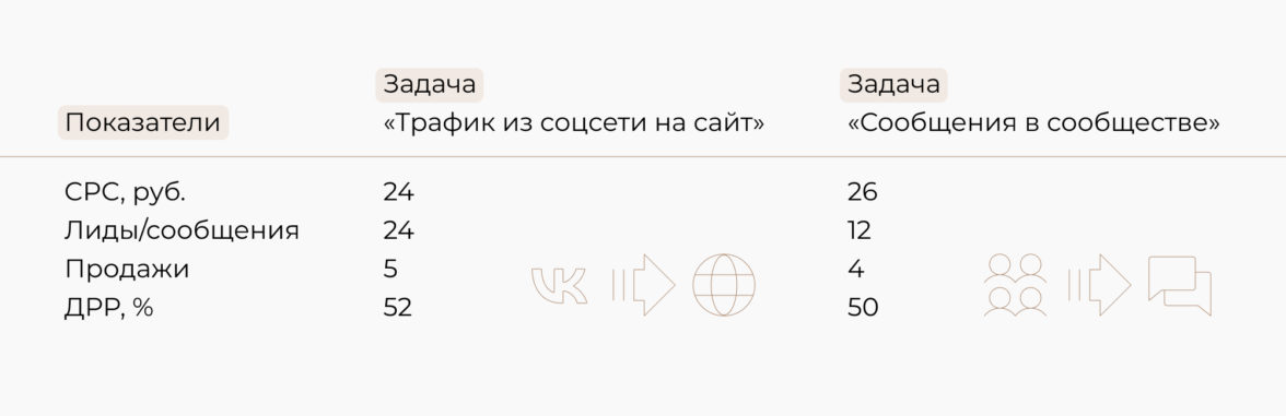 Несмотря на то, что задачу «Сообщения в сообществе» мы выполняли в тестовом режиме и оптимизировали только на переходы, она давала лучший результат, чем задача «Трафик на сайт». Так что мы с заказчиком перераспределили бюджеты и сделали упор на продажах внутри ВКонтакте, до конца месяца пробуя разные типы объявлений и показывая их аудиториям по лестнице Ханта.