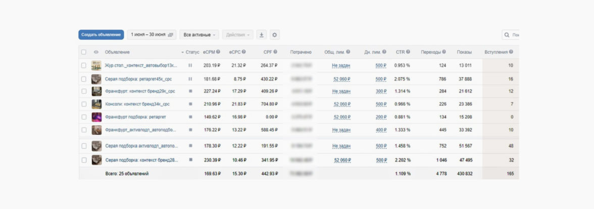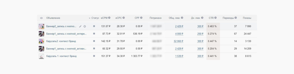 Схема получилась очень дорогой. Во ВКонтакте аудитория выгорала за 4–5 дней, из-за чего CTR уже на вторые сутки после запуска рекламы снизился с 0,8–1% до 0,3–0,4%, а доля рекламных расходов взлетела до космических 191%.
