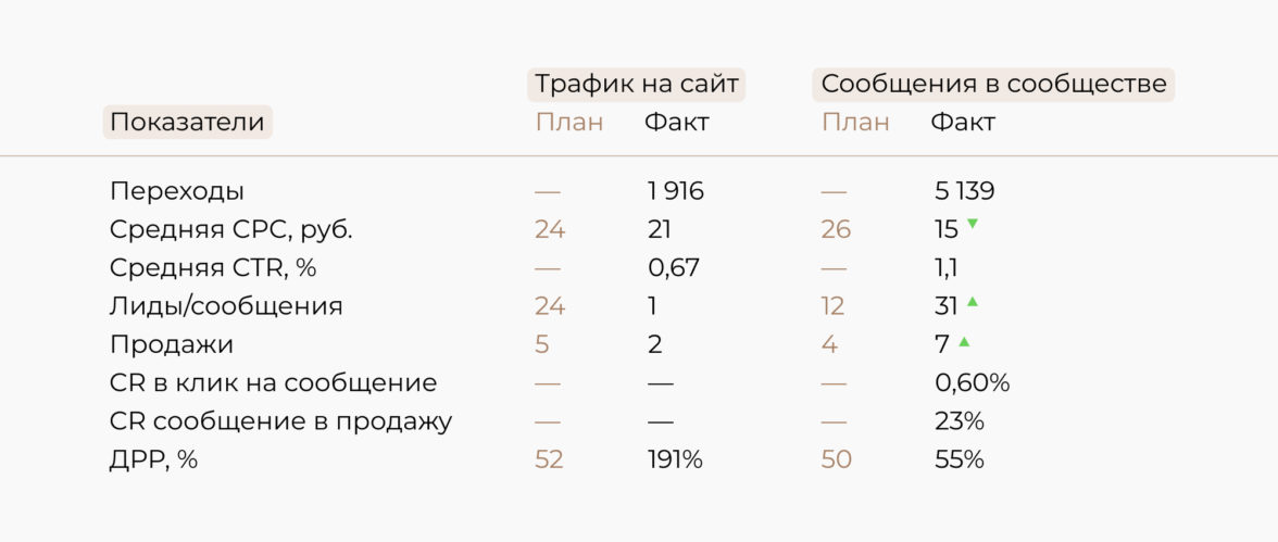 Не все гипотезы сработали одинаково хорошо. Объявления, запущенные на небрендовую семантику и подборки с дизайнерскими баннерами, не принесли результата. Зато реклама, настроенная на брендовую семантику, ретаргет и LAL—аудитории по активным подписчикам сообществ прямых конкурентов исправно приносила конверсии на сообщения.