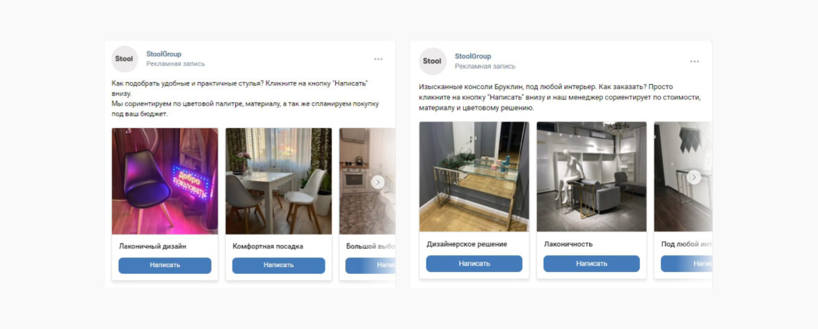 Механика строилась на том, что в рекламном объявлении мы не продавали «в лоб», а предлагали пользователю помощь с выбором подходящей мебели, исходя из его запросов и доступного бюджета. После клика на объявление потенциальный покупатель попадал в диалог с сообществом Stool Group, где можно было узнать у менеджера всё о товаре: размер, цену, наличие на складе, условия доставки.После того, как пользователь получал необходимую информацию и решался на покупку, менеджер бронировал или оформлял заказ в CRM. Там же, в диалогах с сообществом, продолжалось дальнейшее общение с клиентом. Менеджер прямо во ВКонтакте сообщал покупателю возможную дату доставки, возможные варианты оплаты, отрабатывал рекламации и так далее.