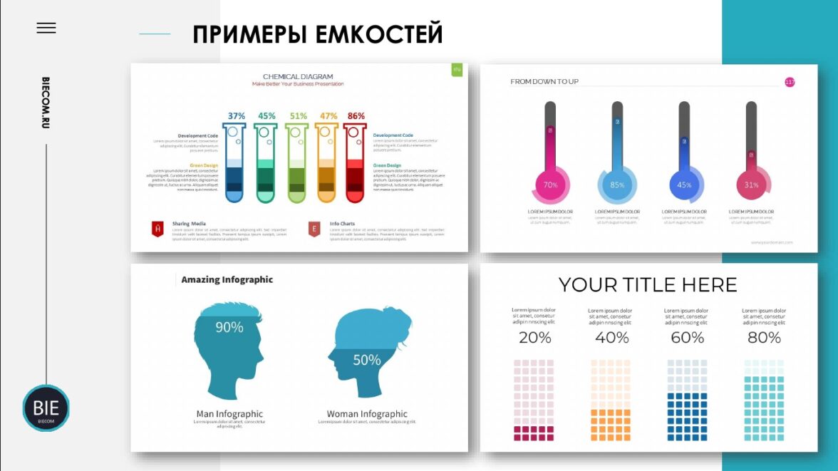 На просторах интернета есть много сайтов, где можно без труда скачать готовые дизайны инфографики. У нас, у команды Biecom, также есть свой магазин, где вы можете скачать шаблоны презентаций абсолютно бесплатно или за минимальную цену. Внутри файлов с проектами вы найдете много полезного, в том числе и варианты инфографики для привлечения внимания аудитории.