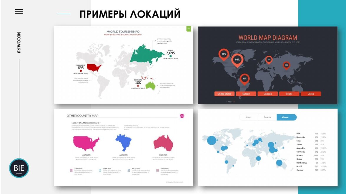 Можно перечислить 15 городов, в которых расположены филиалы вашей организации. А можно показать масштаб с помощью карты и точек на ней. Согласитесь, что второй вариант произведет более сильное впечатление.