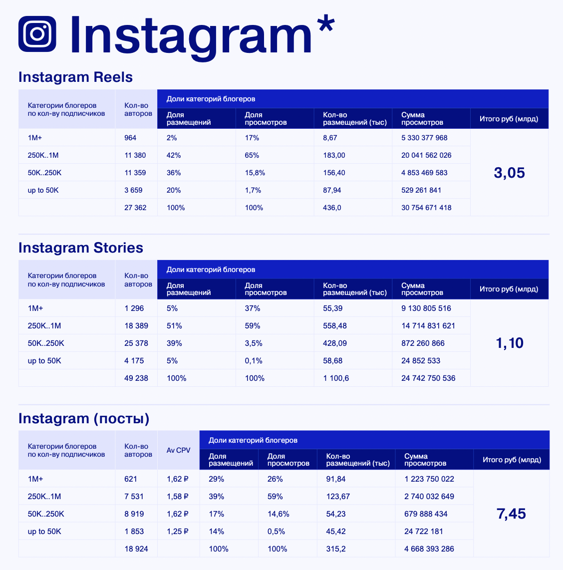 На продвижение у инстаблогеров в 2024 году рекламодатели в России потратили 11,6 млрд рублей — 20% исследованных бюджетов. Ольга Берек не исключает, что объем размещений у блогеров в Instagram в 2024 году может быть даже выше: многие бренды продолжают активно использовать эту платформу из-за ее эффективности и привычных инструментов. До блокировки площадки в 2022 году ее инфлюенсеры, по разным оценкам, получали 35-40% всех рекламных бюджетов.