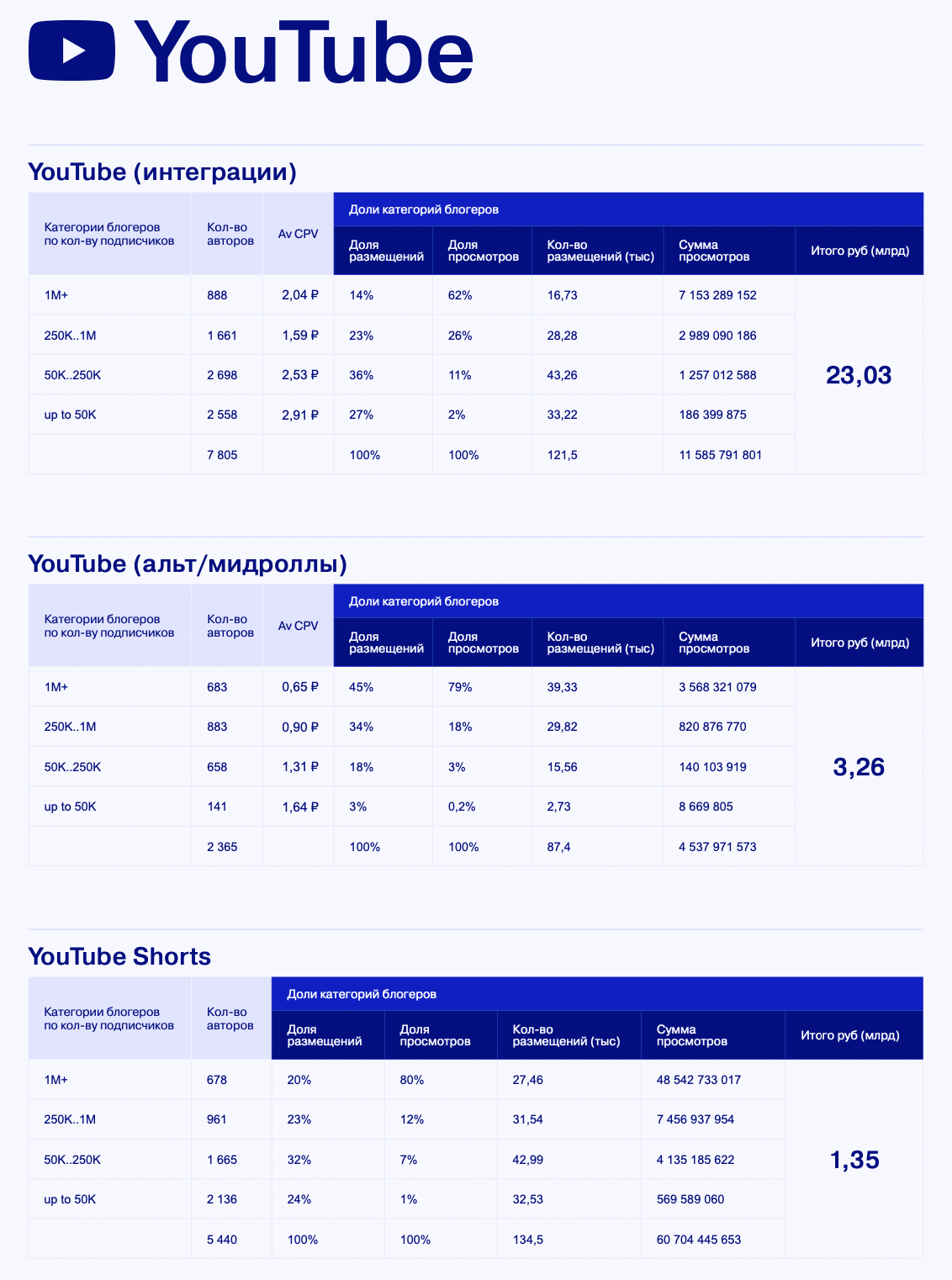 Комитет по инфлюенс-маркетингу АКАР впервые обнародовал подробную детализацию бюджетов рекламодателей по форматам и социальным платформам, ранее такие данные не публиковались. Выснилось, что лидерами по объему бюджетов рекламодателей в России являются блогеры YouTube. На эту площадку пришлась почти половина размещений  (47,9%) — 27,6 млрд рублей.