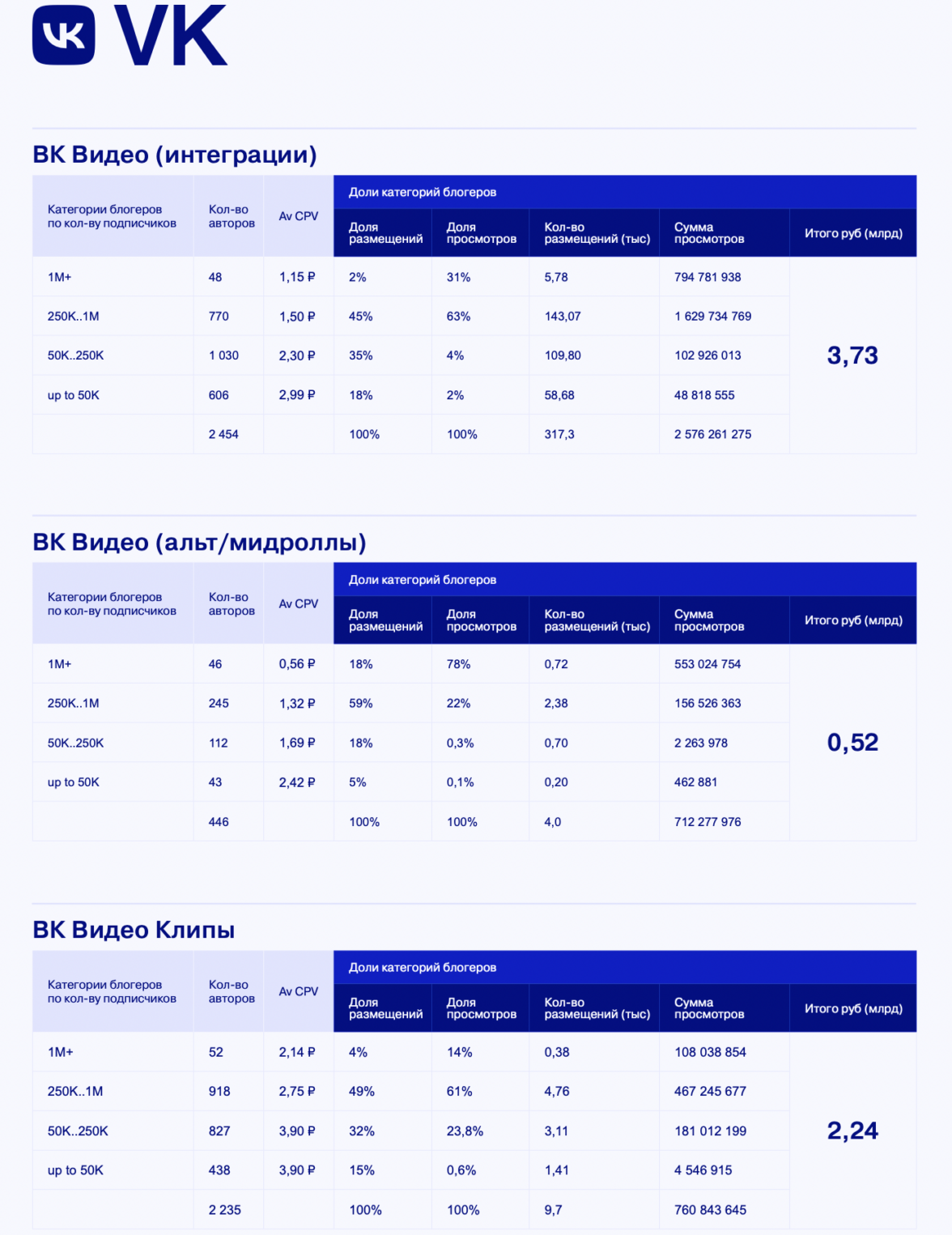 Блогеры «ВКонтакте» в 2024 году разместили сопоставимое с ютуберами количество рекламы: 331 тыс. публикаций, 96% из которых — интеграции в «VK Видео». При этом суммарный охват этих публикаций в 19 раз меньше — всего 4,1 млрд просмотров. Как и в Instagram, по количеству рекламных размещений лидировали макроблогеры.