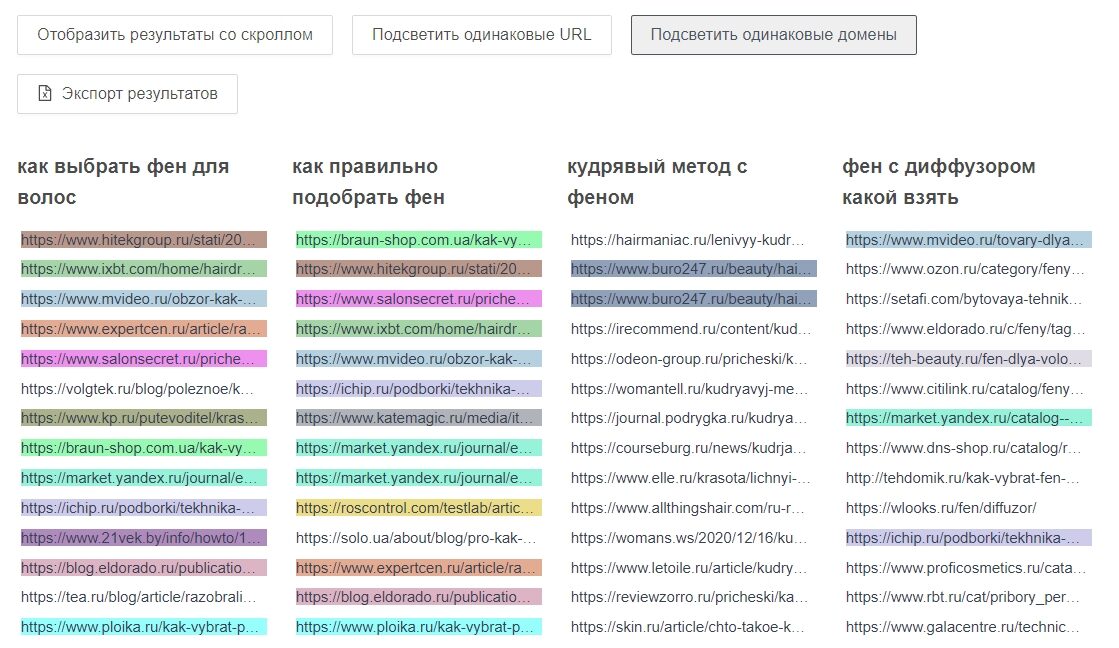 Скопировать в таблицу сайты с первых двух страниц выдачи по этим ключам.