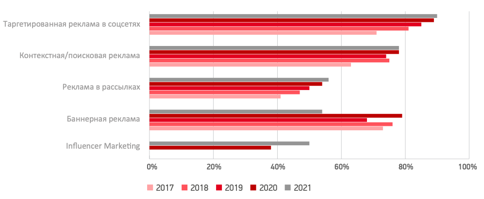 На протяжении последних четырех лет наибольшей популярностью пользовалась таргетированная реклама в социальных сетях. В 2021 году ее использовали 90% опрошенных компаний. Второе место — у контекстной и поисковой рекламы, к ней прибегали 78% опрошенных.
