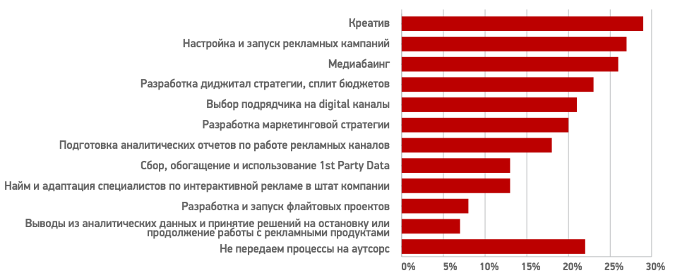 78% опрошенных компаний отдают внешним подрядчикам хотя бы один тип работ по интернет-рекламе. Чаще других на аутсорс передают создание креатива (29% опрошенных), настройку и запуск рекламных кампаний (27% опрошенных) и медиабаинг (26%). Более двух третей респондентов привлекают для продвижения в интернете агенства, так как считают, что их компетенция в этих работах выше. При этом 47% опрошенных компаний хотели бы делать всю работу in-house.