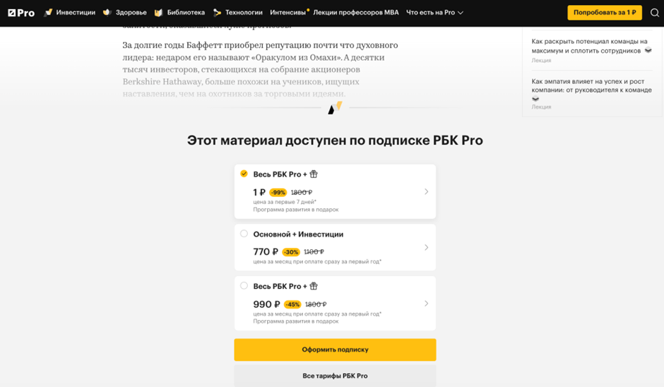 И даже так всегда есть риск потери большой части читателей, которые не готовы взаимодействовать со СМИ исключительно по подписке. В 2010 году, после того, как бесплатное чтение The Times и его воскресного варианта The Sunday Times стало доступно только тем, у кого была подписка на печатное издание, посещаемость сайта упала на 87%.Похожая механика монетизации — у российского СМИ «РБК Pro». Все материалы здесь платные. Но «РБК Pro» — это по сути сервис с доступом к профессиональному контенту, к которому относятся не только статьи, но и онлайн-мероприятия: вебинары и трансляции. Плюс, в подписку могут входить встречи Клуба инвесторов. В то время как основное СМИ — «РБК» — всё же не требует подписки.Также по системе жёсткого пэйвола работают СМИ группы «Актион»: это профессиональные медиа для бухгалтеров, финансовых и коммерческих директоров и других специалистов. Кроме электронной версии выпускаются и печатные журналы. Открыть материал можно свободно, но дочитать до конца не получится — появится всплывающая плашка, которая предлагает оформить подписку после пробного трёхдневного полного доступа.