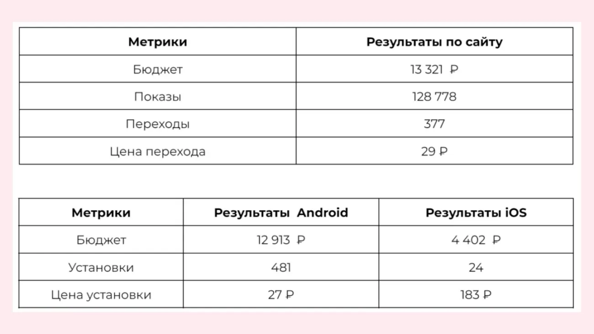 Переходы и установки на Android были недорогие, но их количество не устроило. Установки на IOS выходили дорогими, поэтому эту кампанию тестировали меньше всего — неделю. Скорее всего, гипотеза со старым кабинетом не подтвердилась по нескольким причинам: