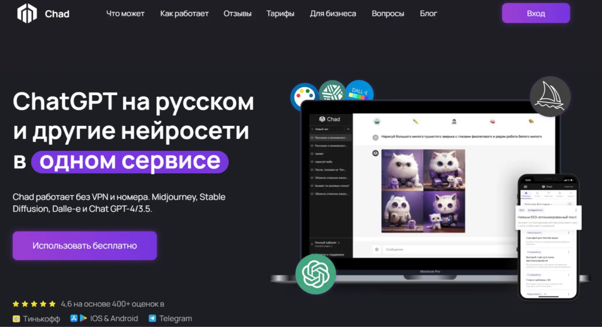 Chad AI — агрегатор нейросетей. Включает в себя ChatGPT 3.5/4, MidJourney, Stable Diffusion и Dalle-e.