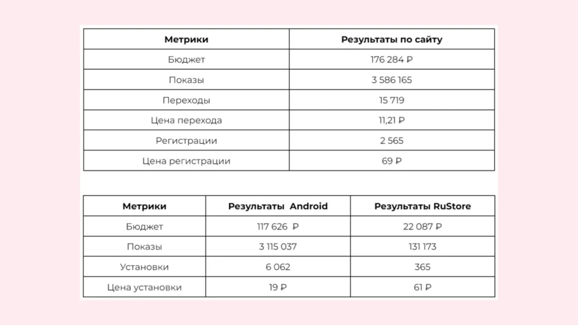 Добавили также кампанию под RuStore, которая перформила лучше iOS. Результаты по ней и кампаниям на сайт и Android за полгода вышли успешнее в новом кабинете, чем в старом. Получили 2565 регистраций на сайте по 69 рублей, 6602 установки Android по 19 рублей и 365 установок RuStore по 61 рублю.