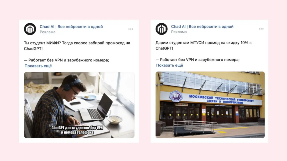 В таких креативах была низкая конверсия, поэтому решили адаптировать изображения под ЦА. Добавили реальные фото вузов под каждое сообщество и фотографии студентов. Также в текст креативов добавили промокод, что должно было улучшить конверсию.