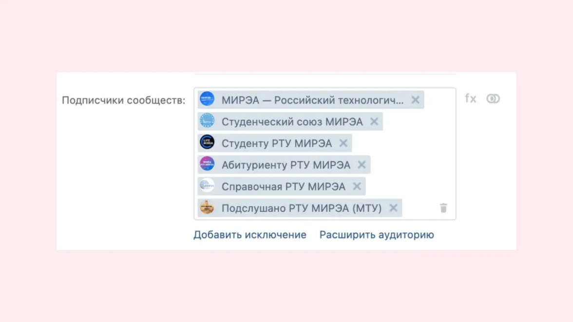 Настроили таргетинг. Таргетировались на подписчиков сообществ вузов: