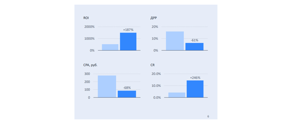 снизить ДРР на -60% (вместо 10 запланированных), при показателе CR в 2,5 раза выше рынка;