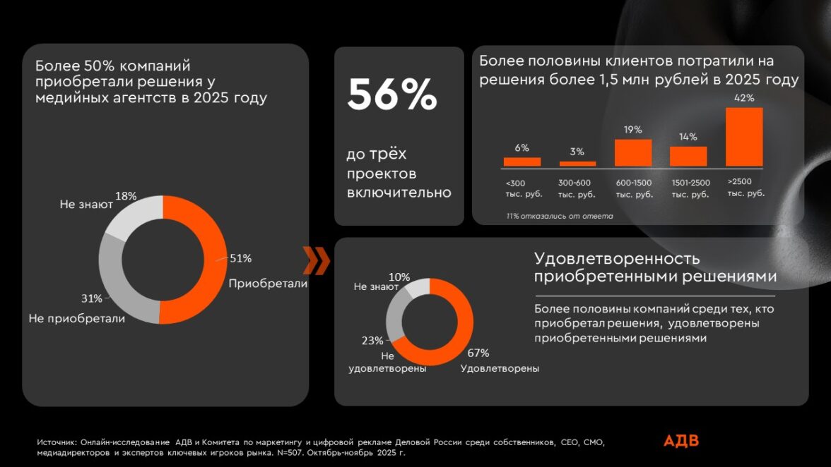 *Источник предоставленных данных: онлайн-исследование АДВ и Комитета по маркетингу и цифровой рекламе Деловой России среди собственников, CEO, СМО, медиадиректоров и экспертов ключевых игроков рынка. N=507. Октябрь-ноябрь 2025 г.