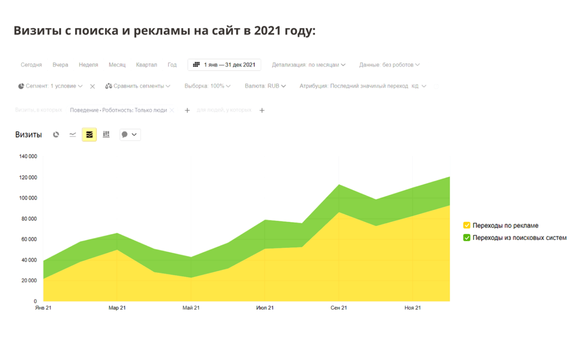 Результат: ежемесячный трафик на сайт вырос в 2 раза — с 60 000 до 120 000, количество заявок держалось на уровне прошлого года — от 950 до 2 700 в месяц.