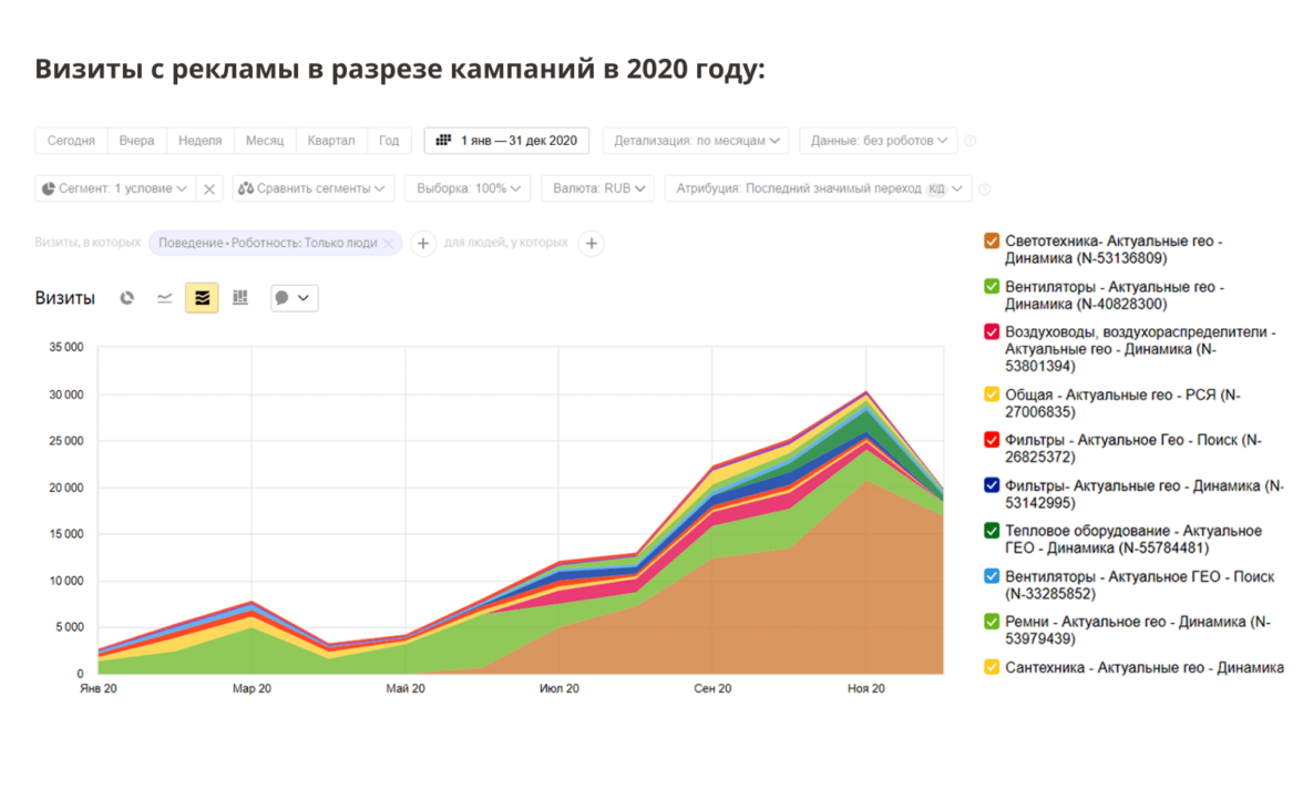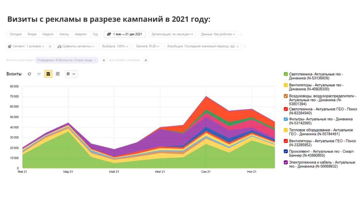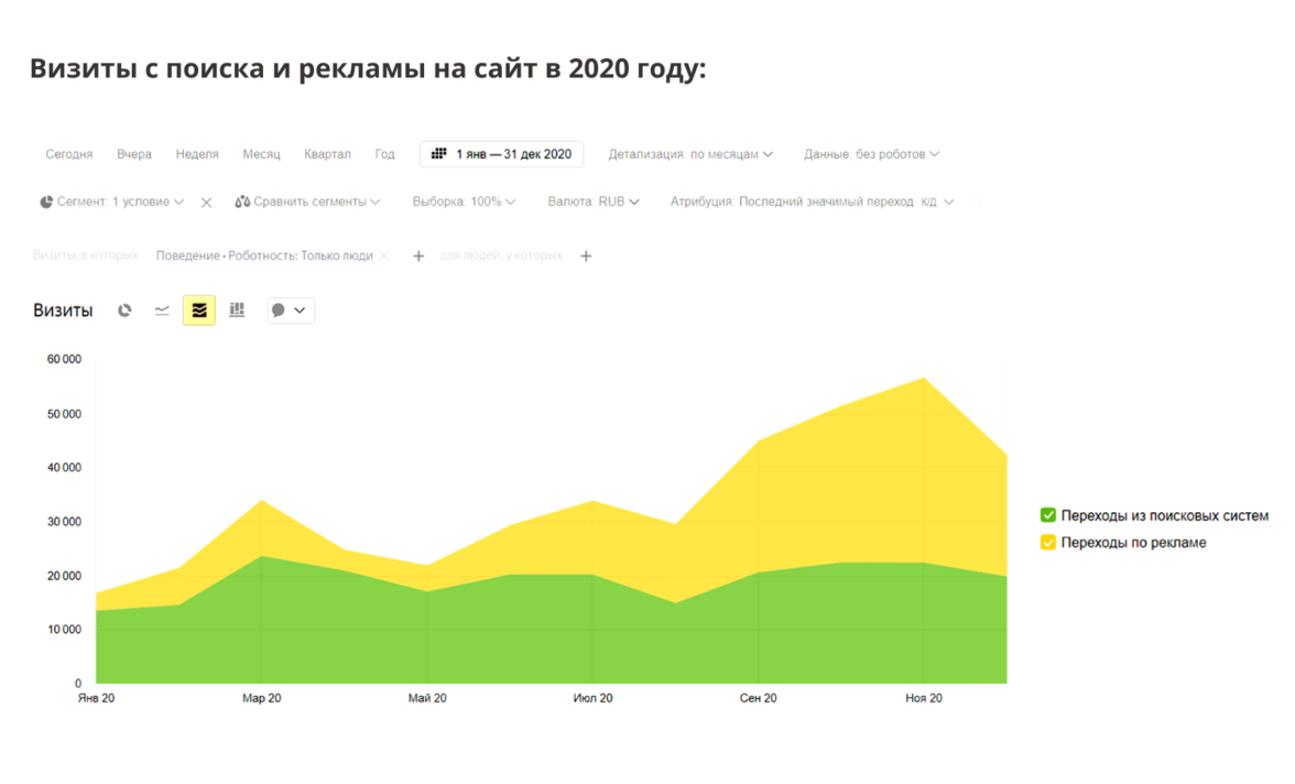 В итоге в 2020 трафик и количество лидов выросло в 2,5 раза благодаря быстрым решениям клиента и работе нашей команды маркетинга. Рекламный трафик в конце 2020 года приносил больше заказов, чем органический, новые категории еще не успели «разогнаться» в поиске: