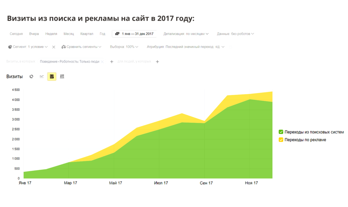 Результат: ежемесячный трафик вырос ещё в три раза — с 6000 до 17500 посетителей, 550–900 заявок в месяц.