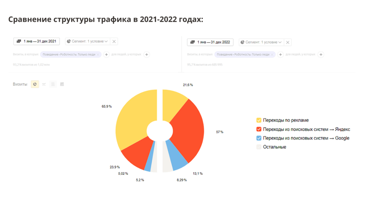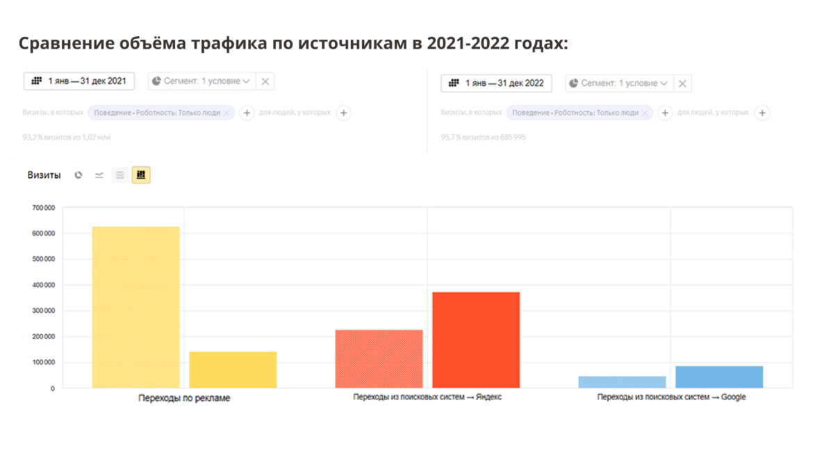 И сравнение в абсолютных значениях. Видим, что рекламный трафик упал, потому что мы сами снизили бюджеты. А вот из поиска — увеличился, как из Яндекс, так и из Google.