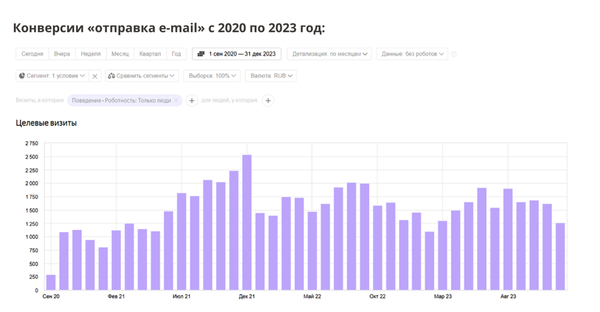 В 2020 году настроили конверсию на отправку электронного письма. На нее ориентируемся до сих пор. Опыт показал, что с электронной почты приходило больше целевых лидов, чем с онлайн-чата.