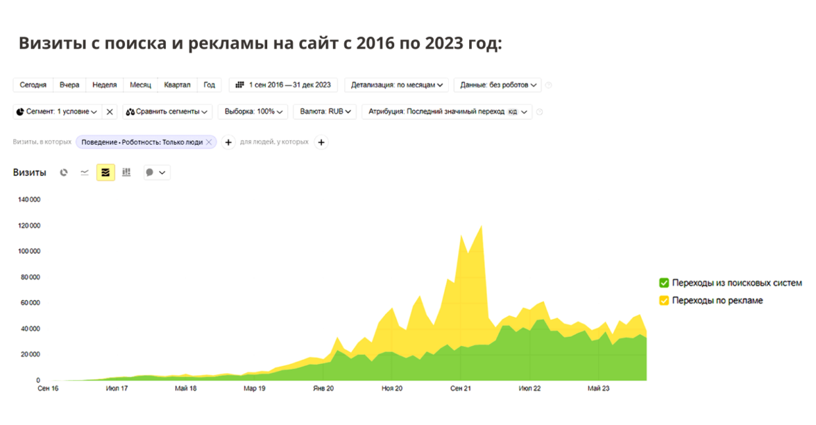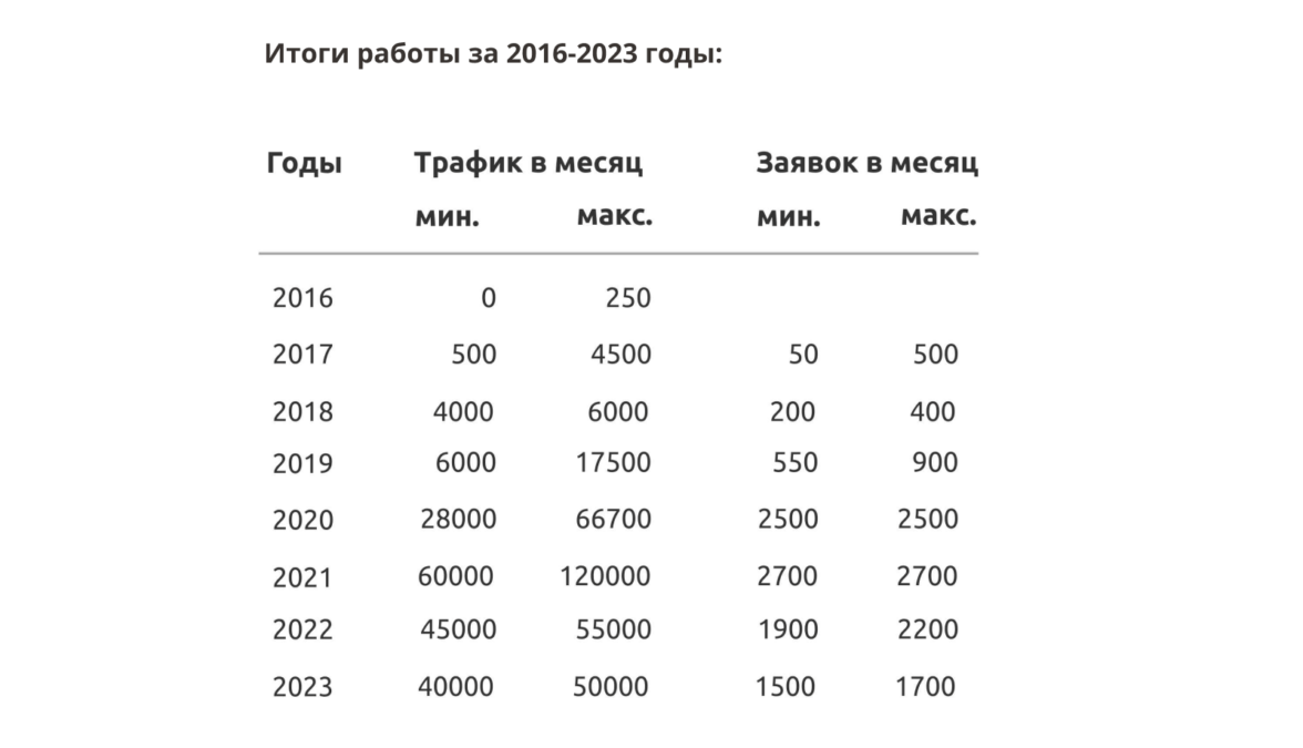 Результат: в 2022 году ежемесячно получали в среднем 55 000 трафика и 2 200 заявок. Трафик упал за счет снижения рекламного бюджета, но количество заявок нам удалось сохранить на уровне прошлого года.
