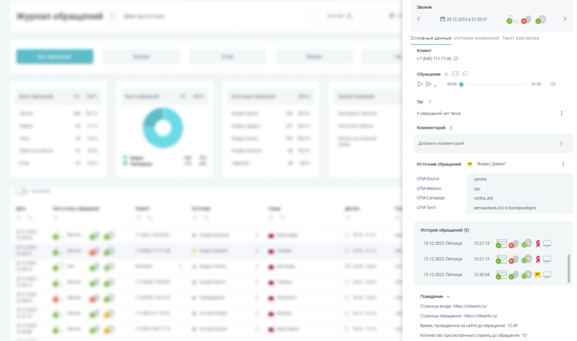 В отчет по каждому лиду попадает информация о визитах пользователя и его поведении на сайте. Мы знаем не только страницу, с которой был совершен звонок, но и сколько раз он был на сайте, прежде чем оставить заявку, какая страница входа, сколько времени провел на сайте до звонка, какое количество страниц просмотрел, а также — когда и какие обращения в компанию оставлял ранее. Последний пункт особенно будет интересен, если его обогатить данными из других трекинг-модулей, чтобы иметь возможность смотреть не только звонки пользователи, но и заполненные им формы, отправленные в компанию письма, переписки в чате на сайте или в мессенджере.