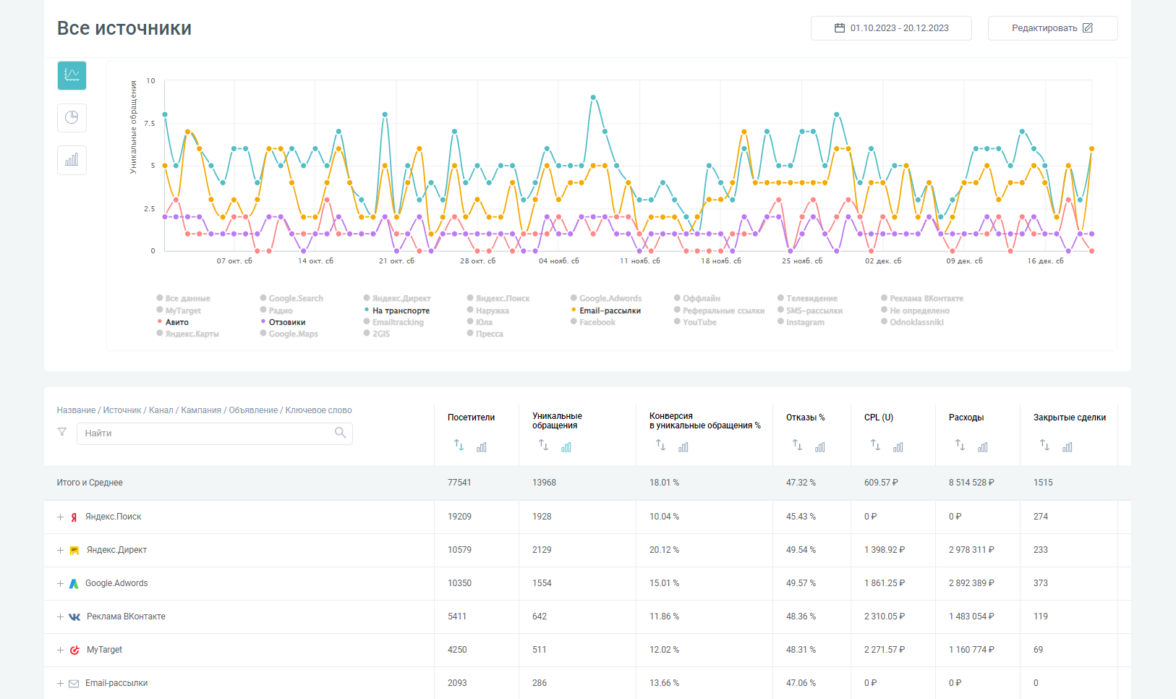 Зная источники всех типов лидов (в том числе в помощью подключенного при необходимости чат-, форм-, email-трекинга и другое) вы сможете максимально точно оценить прирост лидов, полученных за счет работы именно рекламного агентства.