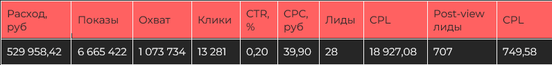 28 прямых лидов при переходе по медийному баннеру и 707 post-view лидов при бюджете 530 000 рублей с НДС;