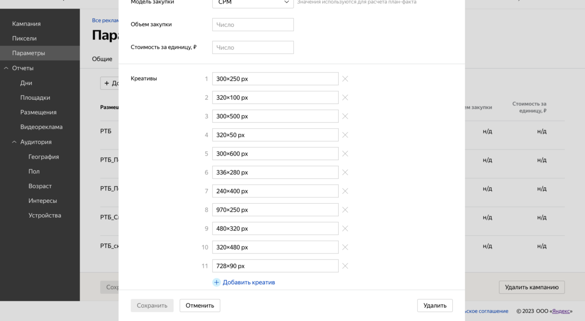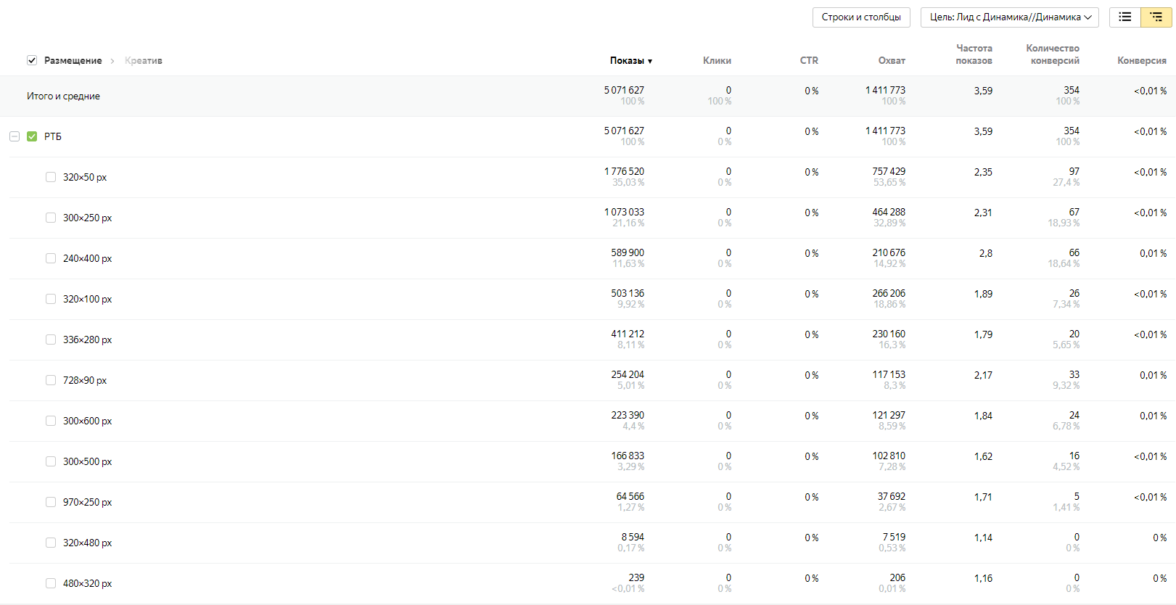 Для более детального отслеживания статистики в размещениях прописали каждый размер баннера отдельно. Таким образом мы смогли оценить: