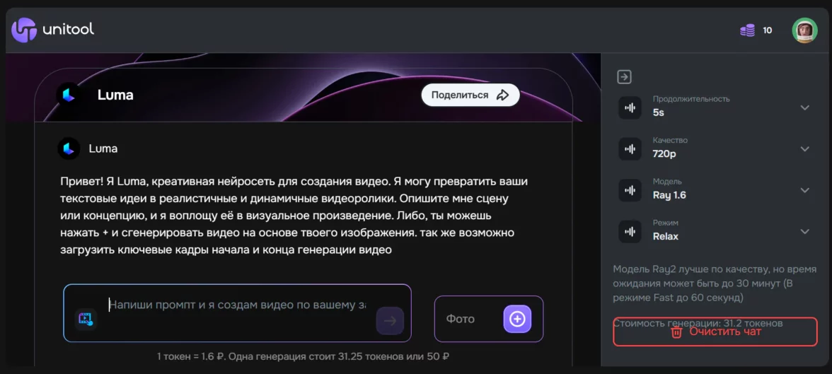 Интерфейс окна генерации в Unitool Luma AI