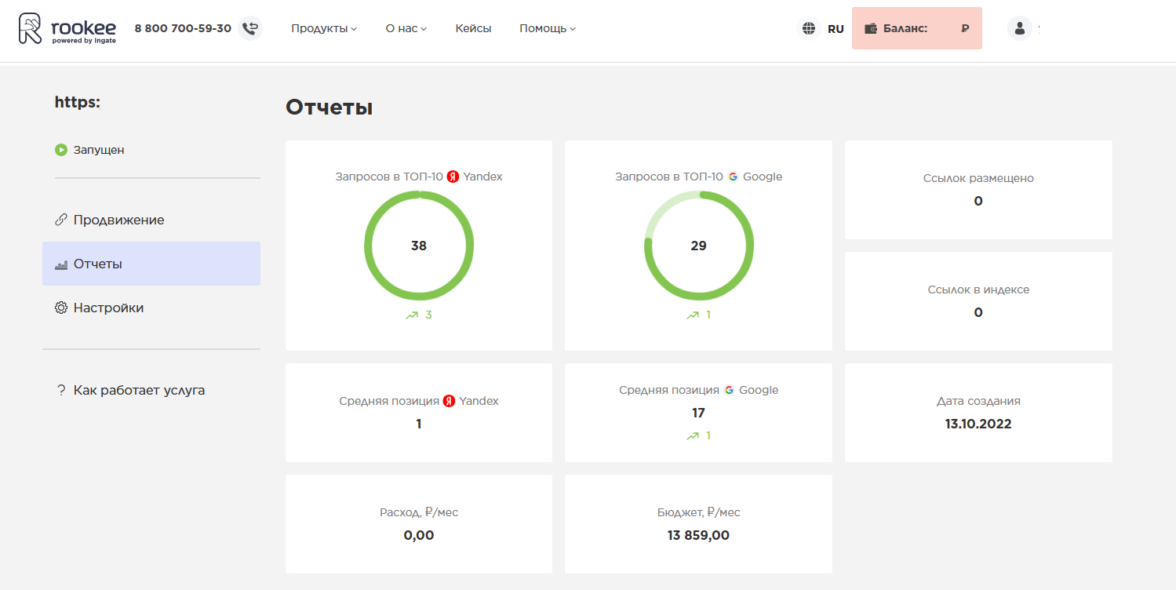 Rookee — это платформа для эффективного продвижения и покупки ссылок. Она позволяет анализировать и повышать видимость сайта, делать SEO-доработки и укреплять онлайн-репутацию. С помощью Rookee можно автоматизировать рутинные задачи — проверку позиций в поисковых системах, подбор запросов для продвижения, размещение SEO-ссылок и т.д.. Стоимость SEO в сервисе — от 3500 рублей в месяц.