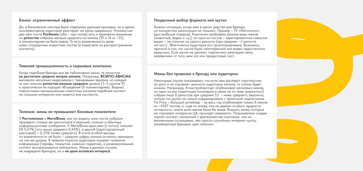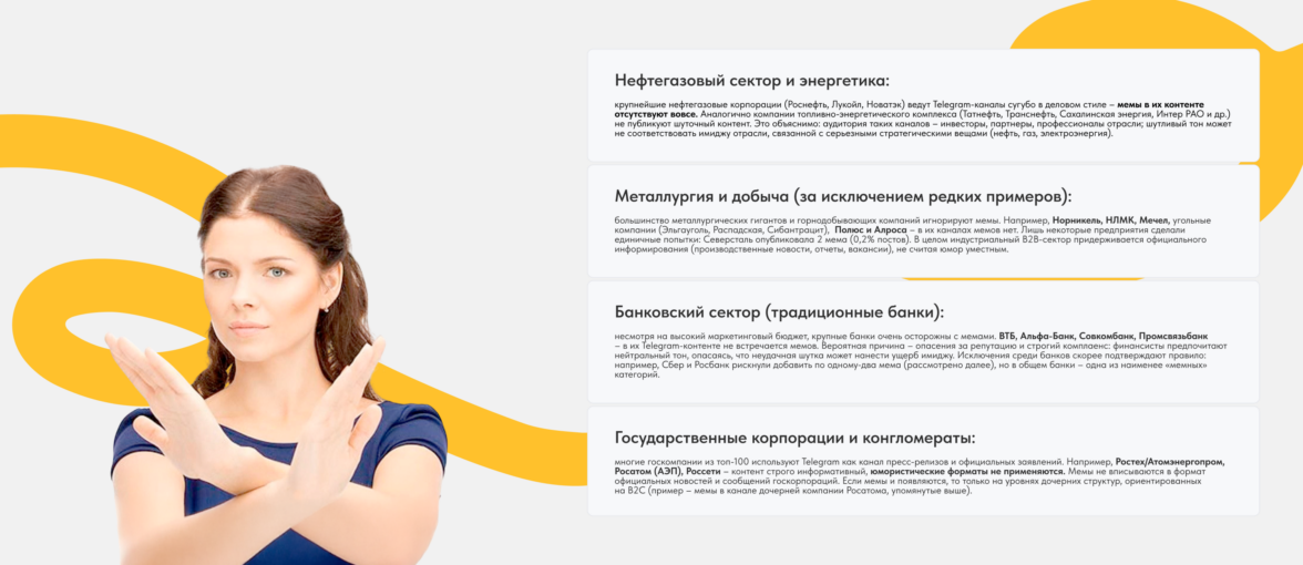 Причина — в доминирующем официальном тоне коммуникации, строгом соблюдении деловой коммуникации и фокусе на зрелую B2B-аудиторию. Мемы здесь воспринимаются как репутационный риск, а не как эффективный инструмент.