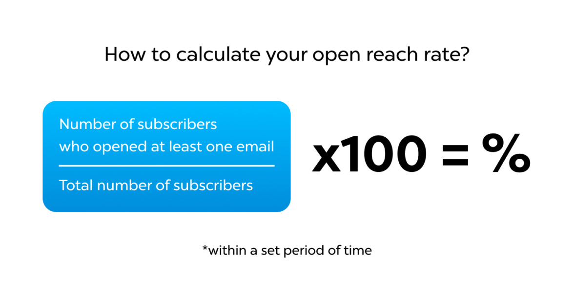 Open reach — это количество уникальных адресатов, которые открыли ваши письма за определённый период времени. От Open rate отличается тем, что показывает, сколько раз на ваши email кликали в почте.