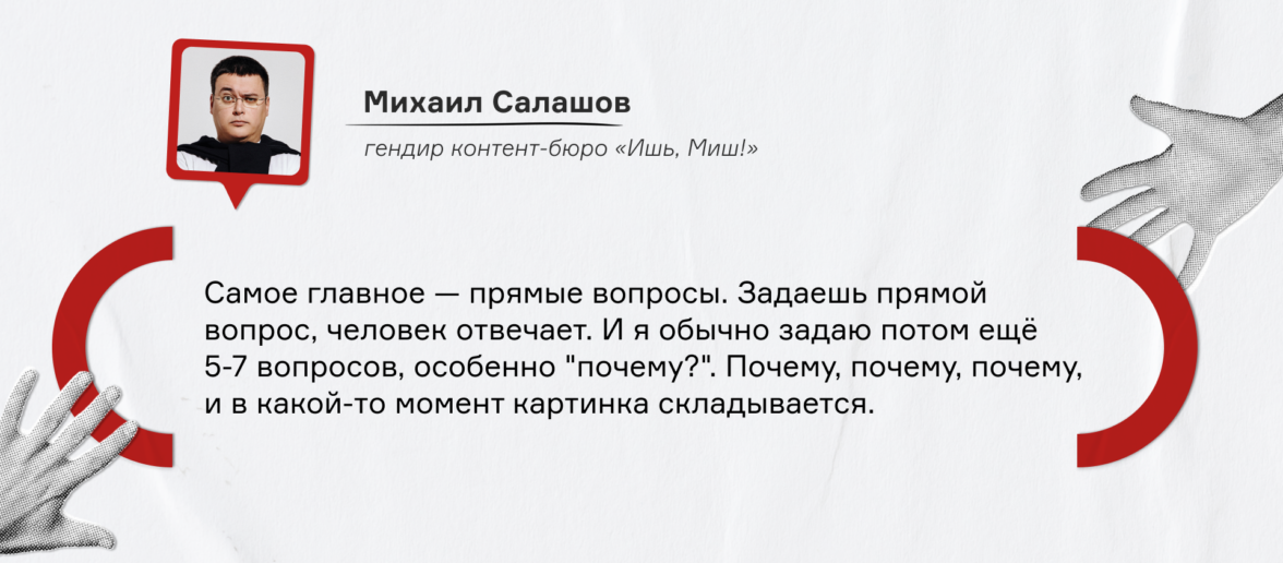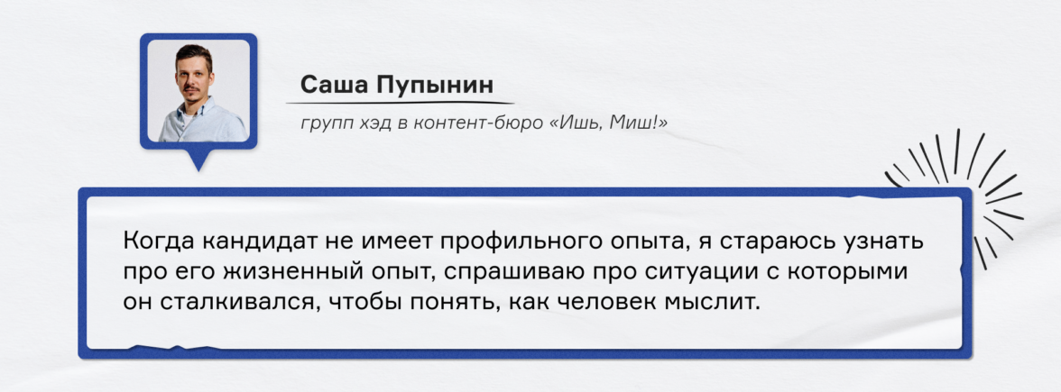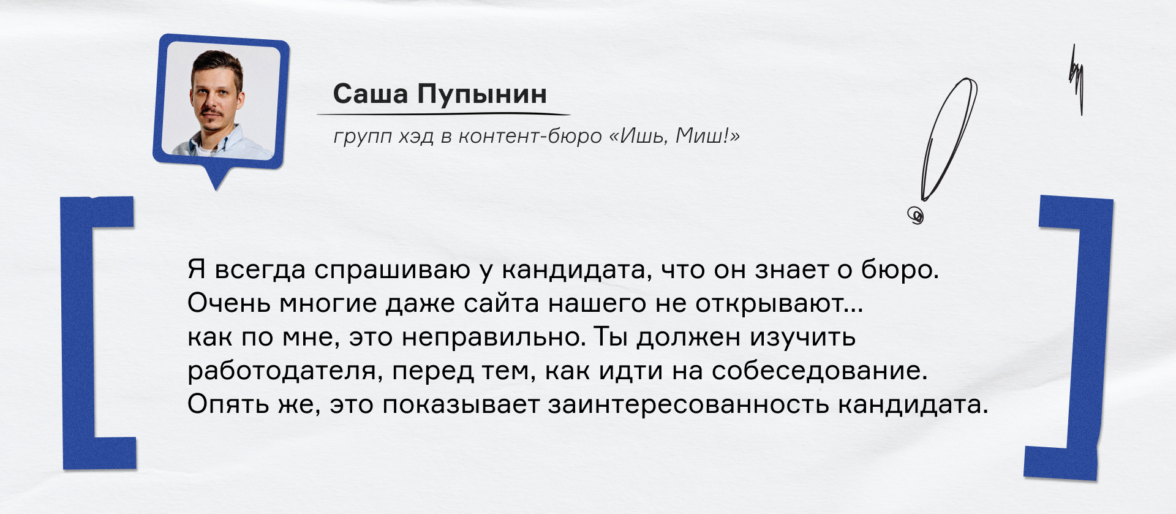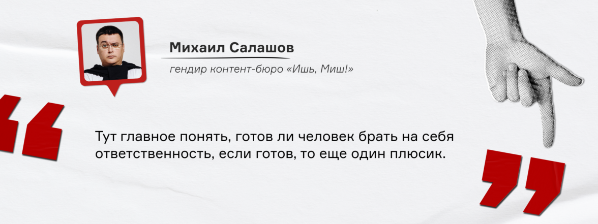 Привет! Мы — контент-бюро «Ишь, Миш!», помогаем своим клиентам решать задачи бизнеса в соцсетях. Топим за живой, объемный контент, а чтобы его создавать, нужны правильные люди. Помимо технических навыков, нам очень важны личные качества соискателей. О чем мы спрашиваем и что мы таким образом проверяем, расскажем в этой статье. Этот список вопросов подойдет для любой должности, так как они не про владение инструментами дизайна или монтажа, а про самого человека и его софт-скилы.