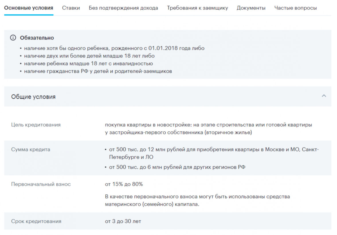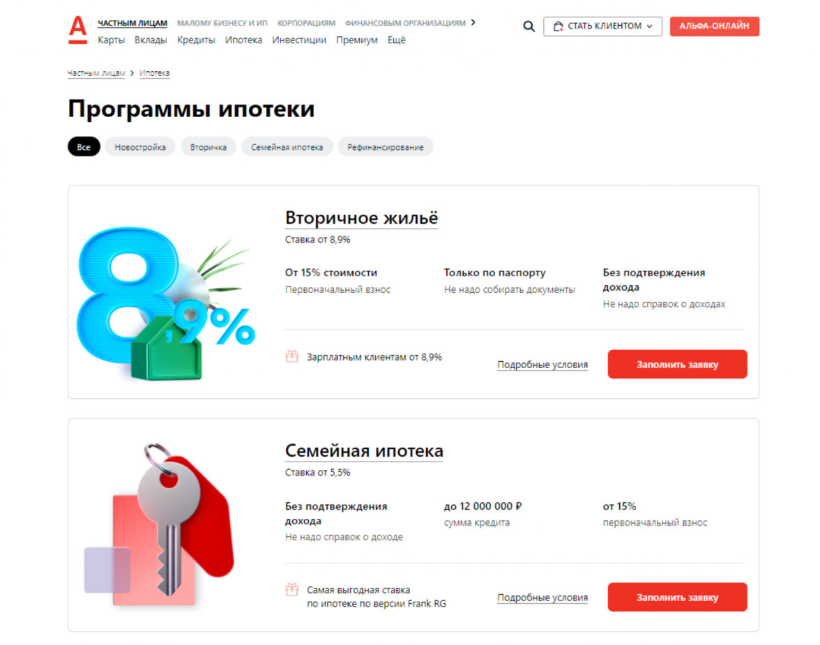 Например, на сайте Альфа-банка программы можно найти по удобным фильтрам с названиями «Новостройка», «Вторичка», «Семейная ипотека».