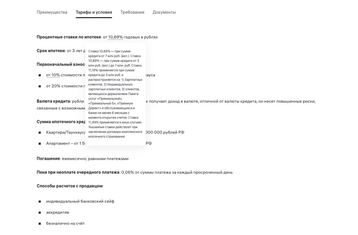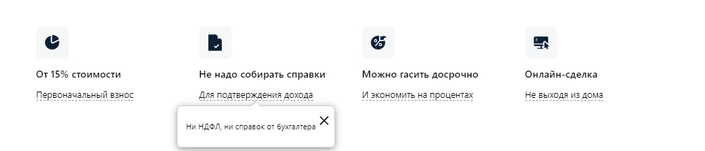 Еще один пример лишнего скрытия текста — преимущества ипотеки в Альфа-банке. В этом случае проще переписать преимущества и избавиться от подсказок.