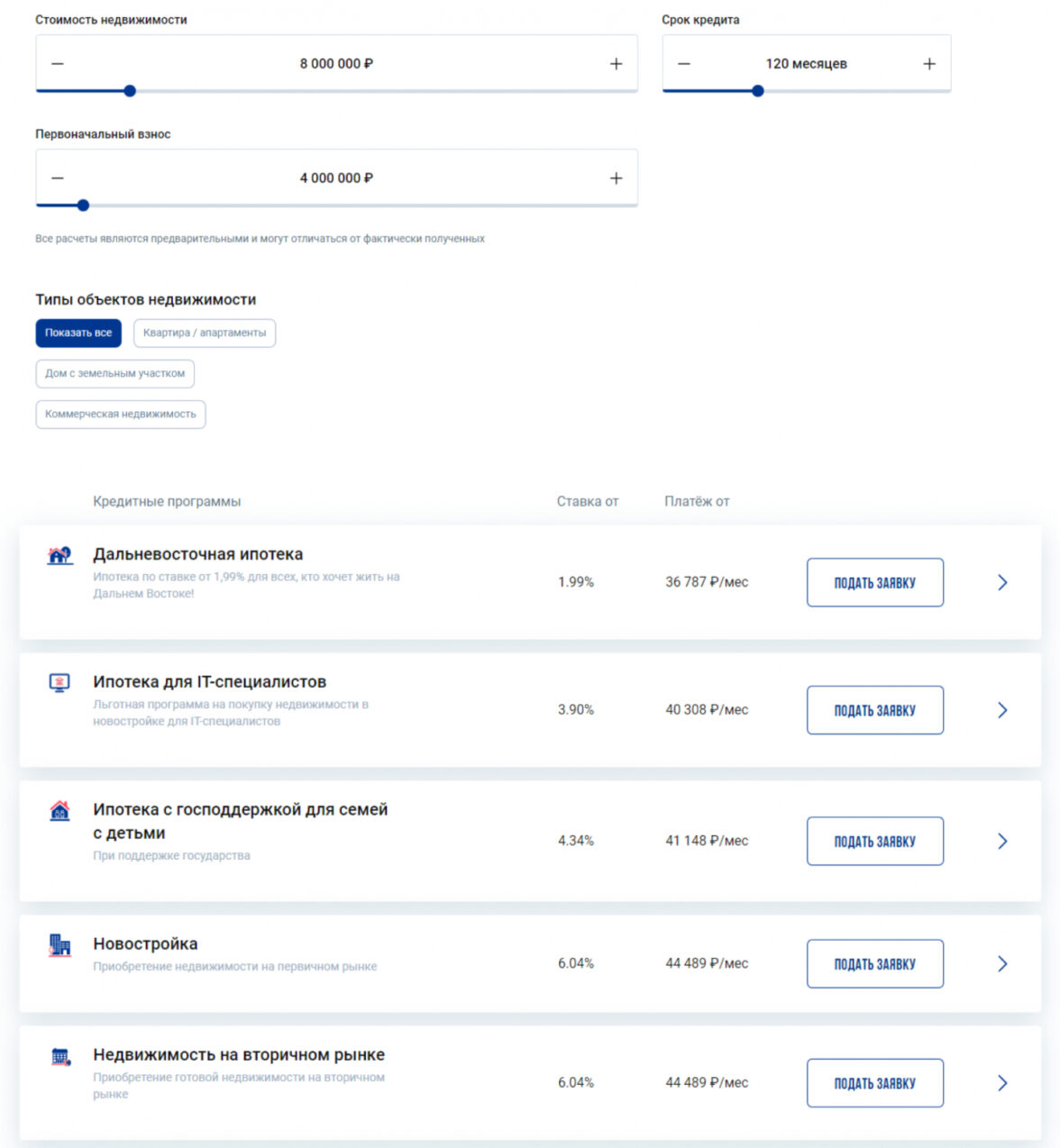 Хорошее решение — сделать разводящую страницу с карточками программ. Обычно на такой странице собирают главные преимущества, на которых нужно сделать акцент: ставку, первый взнос, сумму кредита и количество документов, которое потребуется от клиента. Еще на такой странице можно сделать удобный фильтр, чтобы найти ипотеку по определенным критериям было просто.