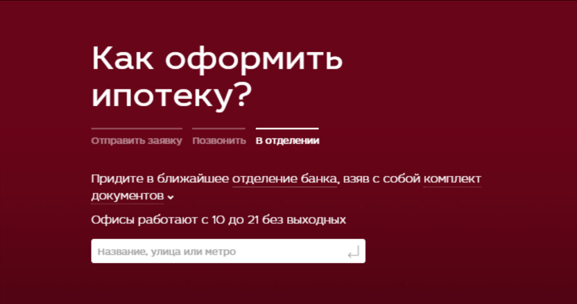 МКБ предлагает на выбор, как пользователям будет удобно оформлять ипотеку: отправить заявку, позвонить или обратиться в отделение.