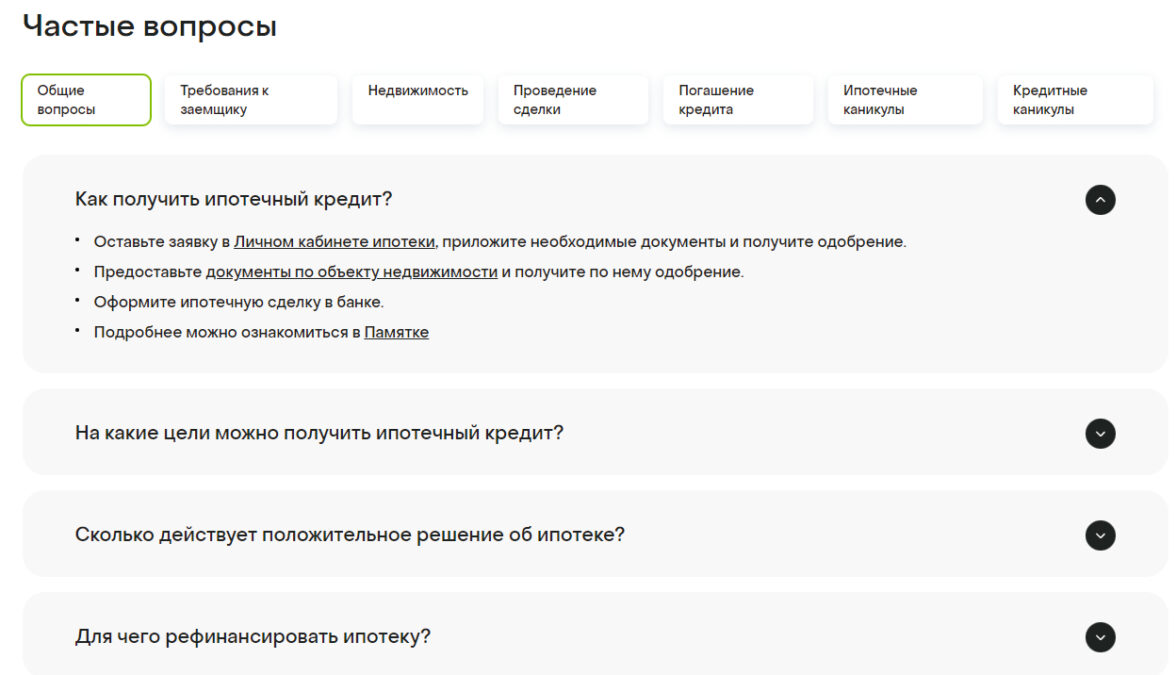 Чтобы помочь пользователям разобраться с условиями можно сделать блок с часто задаваемыми вопросами. Это удобно, если у пользователей возникают однотипные вопросы, нужно снизить нагрузку со службы поддержки или подсветить важную информацию. Например, так делают ВТБ и Газпромбанк. Ответы на вопросы четкие, с полезными ссылками и объяснением непонятного.