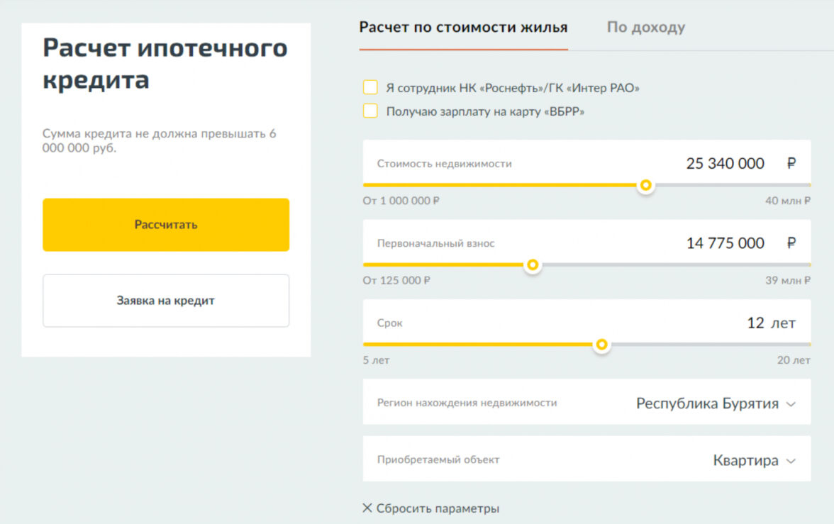 Ежемесячный платеж практически все банки предлагают рассчитать в ипотечном калькуляторе. Пользователи могут передвигать ползунок и выбирать срок кредита, первоначальный взнос, регион, где они планируют купить жилье и на основании чего рассчитывать кредит — стоимости жилья или дохода.