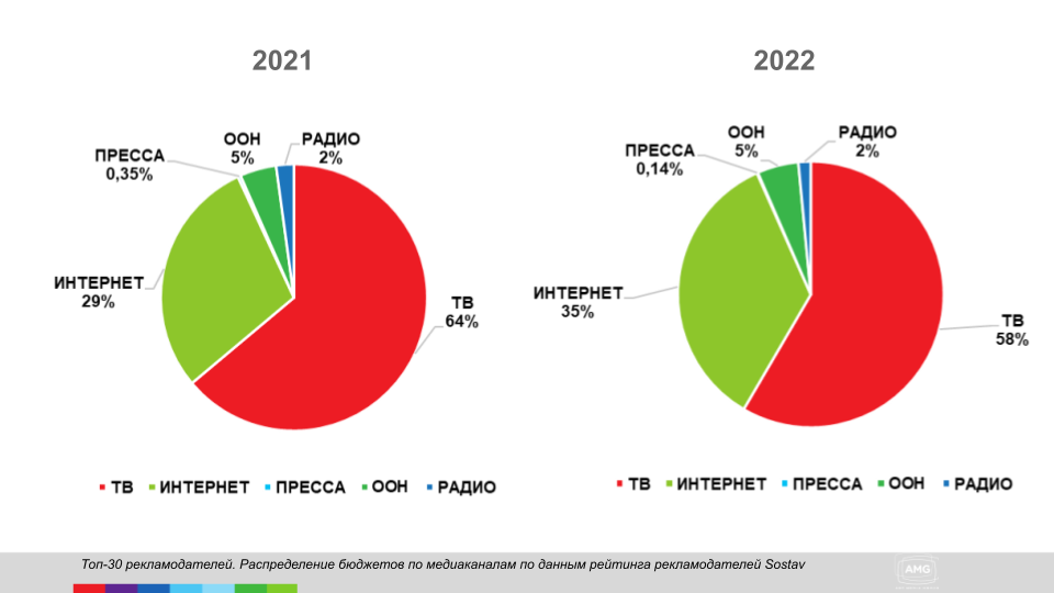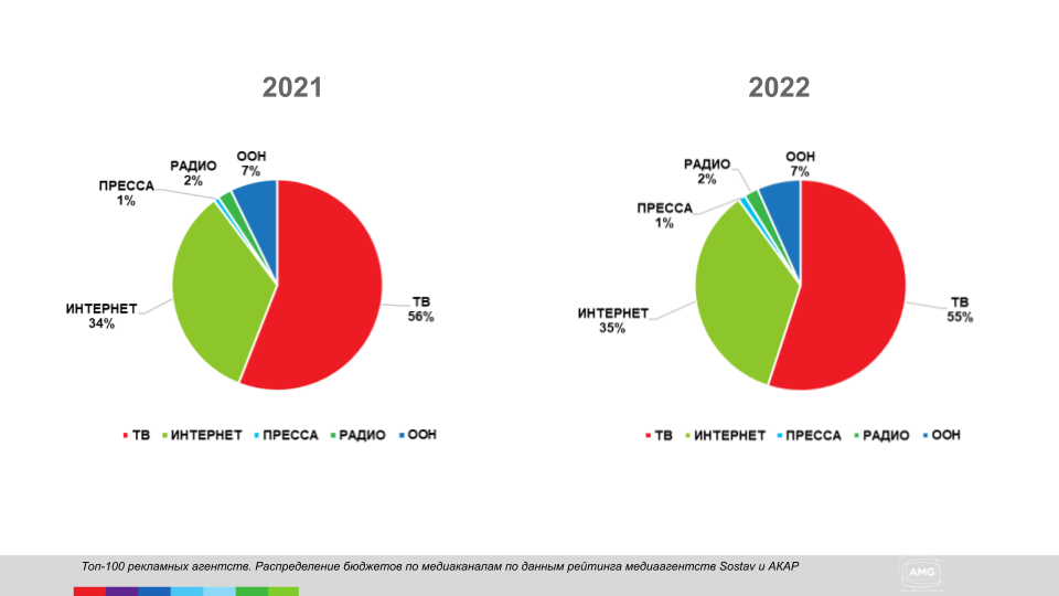 Тренды по рынку, в том числе региональному, традиционно задают топ-30 рекламодателей РФ и данные о размещениях топ-100 агентств (рейтинг АКАР и Sostav — прим. AMG). Можно отметить, что с 2021 года они принципиально не изменились, что наглядно демонстрируют диаграммы ниже. Лидером по-прежнему остается реклама на ТВ, забирая более половины бюджетов.