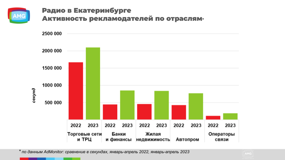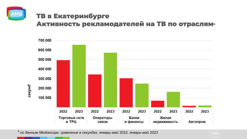 Чтобы отследить динамику, мы посмотрели объемы размещения по отраслям, но не в деньгах, а в секундах. По радио мы проанализировали период с января по апрель 2022-го и 2023-го. По размещениям на ТВ — массив данных за пять месяцев 2022 и аналогичный период 2023-го годов.